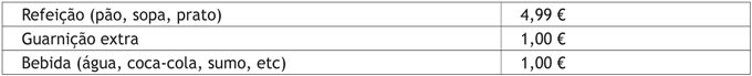 Serviço disponível de segunda a sexta. Para ser fornecido aos fins-de-semana tem de ser efetuadas encomendas para grupos e o pedido realizado na semana anterior.
